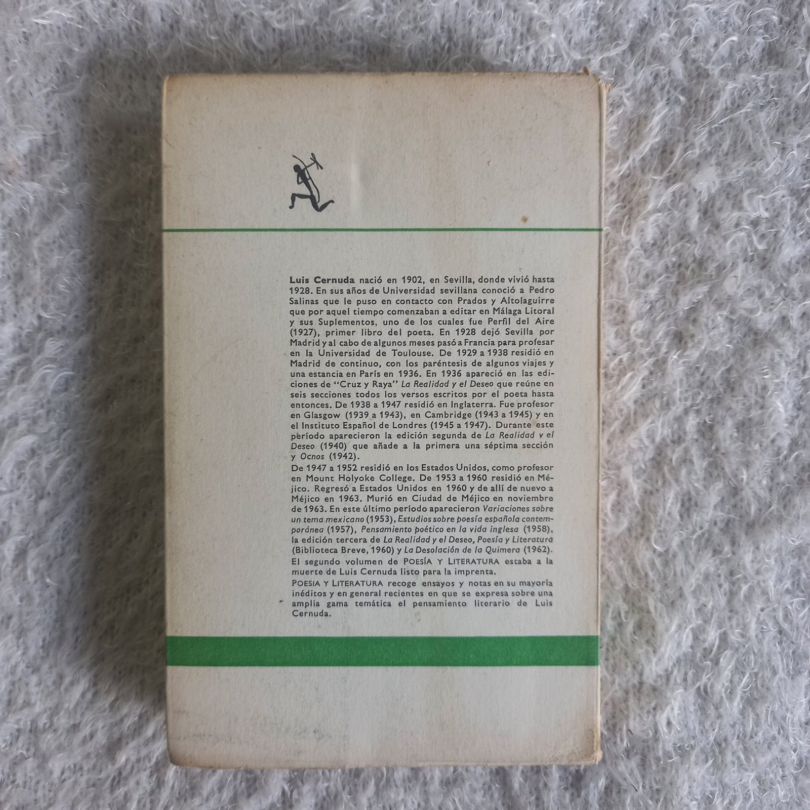 Luis Cernuda nació en 1902, en Sevilla, donde vivió hasta 1928. En sus años de Universidad sevillana conoció a Pedro Salinas que le puso en contacto con Prados y Altolaguirre que por aquel tiempo comenzaban a editar en Málaga Litoral y sus Suplementos, uno de los cuales fue Perfil del Aire (1927), primer libro del poeta. En 1928 dejó Sevilla por Madrid y al cabo de algunos meses pasó a Francia para profesar en la Universidad de Toulouse. De 1929 a 1938 residió en Madrid de continuo, con los paréntesis de algunos viajes y una estancia en París en 1936. En 1936 apareció en las ediciones de “Cruz y Raya” La Realidad y el Deseo que reúne en seis secciones todos los versos escritos por el poeta hasta entonces. De 1938 a 1947 residió en Inglaterra. Fue profesor en Glasgow (1939 a 1943), en Cambridge (1943 a 1945) y en el Instituto Español de Londres (1945 a 1947). Durante este período aparecieron la edición segunda de La Realidad y el Deseo (1940) que añade a la primera una séptima sección y Ocnos (1942). De 1947 a 1952 residió en los Estados Unidos, como profesor en Mount Holyoke College. De 1953 a 1960 residió en Méjico. Regresó a Estados Unidos en 1960 y de allí de nuevo a Méjico en 1963. Murió en Ciudad de Méjico en noviembre de 1963. En este último período aparecieron Variaciones sobre un tema mexicano (1953), Estudios sobre poesía española contemporánea (1957), Pensamiento poético en la vida inglesa (1958), la edición tercera de La Realidad y el Deseo, Poesía y Literatura (Biblioteca Breve, 1960) y La Desolación de la Quimera (1962). El segundo volumen de POESÍA Y LITERATURA estaba a la muerte de Luis Cernuda listo para la imprenta. POESIA Y LITERATURA recoge ensayos y notas en su mayoría inéditos y en general recientes en que se expresa sobre una amplia gama temática el pensamiento literario de Luis Cernuda.