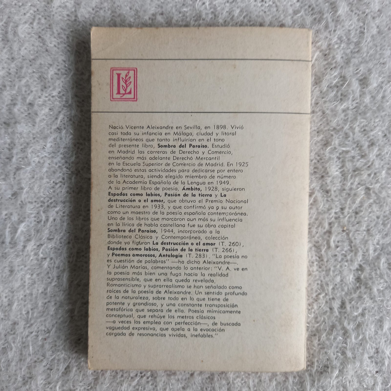 Nació Vicente Aleixandre en Sevilla, en 1898. Vivió casi toda su infancia en Málaga, ciudad y litoral mediterráneos que tanto influirían en el tono del presente libro, Sombra del Paraíso. Estudió en Madrid las carreras de Derecho y Comercio, enseñando más adelante Derechò Mercantil en la Escuela Superior de Comercio de Madrid. En 1925 abandonó estas actividades para dedicarse por entero a la literatura, siendo elegido miembro de número de la Academia Española de la Lengua en 1949. A su primer libro de poesía, Ámbito, 1928, siguieron Espadas como labios, Pasión de la tierra y La destrucción o el amor, que obtuvo el Premio Nacional de Literatura en 1933, y que confirmó ya a su autor como un maestro de la poesía española contemporánea. Uno de los libros que marcaron aun más su influencia en la lírica de habla castellana fue su obra capital Sombra del Paraíso, 1944, incorporado a la Biblioteca Clásica y Contemporánea, colección donde ya figuran La destrucción o el amor, Espadas como labios, Pasión de la tierra y Poemas amorosos, Antología. “La poesía no es cuestión de palabras” -ha dicho Aleixandre- Y Julián Marías, comentando lo anterior: “V. A. ve en la poesía más bien una fuga hacia la realidad suprasensible, que en ella queda revelada Romanticismo y suprarrealismo se han señalado como raíces de la poesía de Aleixandre. Un sentido profundo de la naturaleza, sobre todo en lo que tiene de potente y grandioso, y una constante transposición metafórica que separa de ella. Poesía mímicamente conceptual, que rehúye los metros clásicos -a veces los emplea con perfección-, de buscada vaguedad expresiva, que apela a la evocación cargada de resonancias vividas, inefables.”
